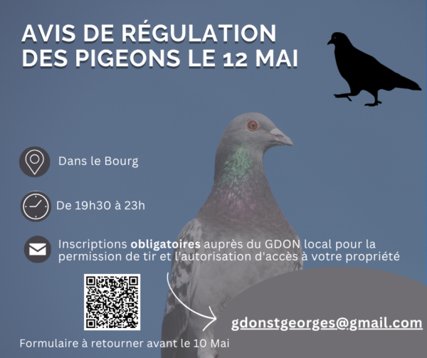 Une campagne de régulation de la population de pigeons va avoir lieu dans le bourg le 12 Mai prochain, en soirée avec le GDON de Saint Georges.